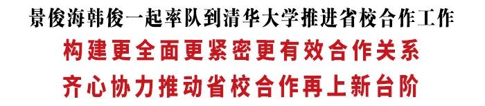 为深入贯彻习近平总书记视察吉林重要讲话重要指示精神,4月13日,省委书记景俊海,省委副书记、省长韩俊一起率吉林省党政代表团到清华大学,实地调研科研项目攻关及成果转化情况,并与清华大学党委书记陈旭、校长邱勇举行会谈,进一步对接“十四五”规划实施,构建更全面更紧密更有效合作关系,齐心协力推动省校合作再上新台阶。