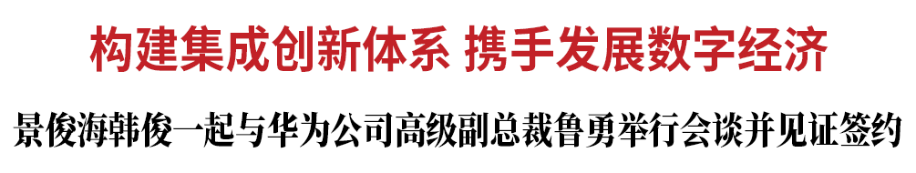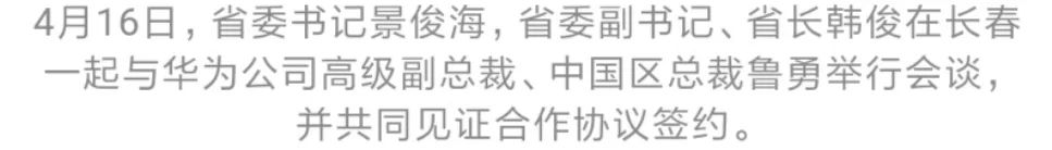 4月16日,省委书记景俊海,省委副书记、省长韩俊一起与华为公司高级副总裁、中国区总裁鲁勇在长春举行会谈,并共同见证我省有关方面与华为公司签署《华为吉林区域总部项目协议》《吉林市人民政府与华为技术有限公司战略合作协议》。