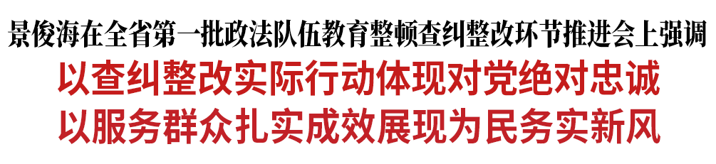 景俊海指出,当前,我省第一批政法队伍教育整顿已经进入查纠整改的最后冲刺期、攻坚期,必须采取更加有力措施,补齐短板弱项,解决突出问题,确保政法队伍教育整顿持续深入开展、取得更大成效。一要坚持履责担当,各地各有关单位领导干部特别是各市县“一把手”要把开展政法队伍教育整顿作为践行“两个维护”的实际行动,进一步强化斗争意识、增强斗争精神、提高斗争本领,牵头研究破解制约政法队伍健康发展的体制性、机制性、保障性问题,持续深化执法司法制约监督体系改革,完善从严管理队伍长效机制,选优配齐政法机关班子成员,努力打造一支让党和人民信得过、靠得住、能放心的政法铁军。二要坚持从严执纪,全面实行领导包案,强化督导督办,加强协同办案,推动组织查处取得突破,彻底清除一批害群之马,切实形成高压震慑态势。三要坚持精准高效,把严格依规依纪依法贯穿监督执纪执法全过程,精准适用“自查从宽、被查从严”政策,充分运用“四种形态”兑现政策,进一步深化思想发动和政策宣讲,真正做到宽严适度、宽严相济,充分体现惩前毖后、治病救人的要求。四要坚持标本兼治,科学研判分析,精准推进整改,系统建章立制,以制度思维和制度方式根治顽瘴痼疾,确保既有立竿见影的实效,又有抓源治本的长效。五要坚持用心用情,紧密结合党史学习教育、政法队伍教育整顿,深入开展全省政法系统“十百千万”为民实践活动,进一步缩小光圈、校准靶心,集中出台一批优化政法机关公共服务的政策举措,拿出一批强化民生领域执法司法的实招硬招,实施一批坚持和发展新时代“枫桥经验”的具体措施,推出一批推进政法领域全面深化改革的制约监督举措,建立和完善“我为群众办实事”长效工作机制,把实事做得更接地气、更暖人心、更可持续,让人民群众得到真实惠、感受新气象。