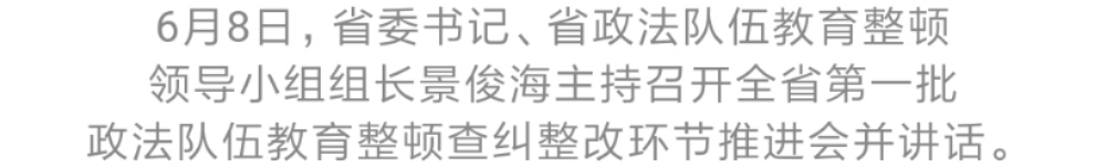 6月8日,省委书记、省政法队伍教育整顿领导小组组长景俊海主持召开全省第一批政法队伍教育整顿查纠整改环节推进会。他强调,要深入贯彻习近平总书记关于政法队伍教育整顿的重要讲话重要指示精神,认真落实中央督导组督导要求,高质量推动政法队伍教育整顿,以查纠整改实际行动体现对党绝对忠诚,以服务群众扎实成效展现为民务实新风。