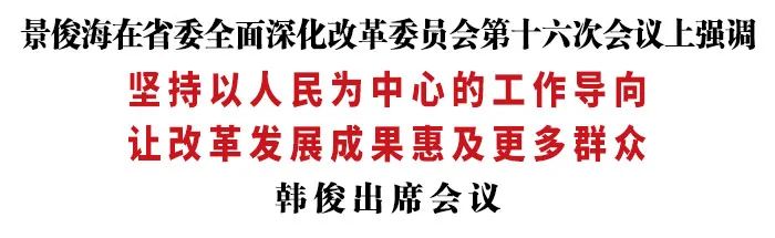 6月7日,省委书记、省委全面深化改革委员会主任景俊海主持召开省委全面深化改革委员会第十六次会议。他强调,要深入贯彻习近平总书记在中央全面深化改革委员会第十九次会议上的重要讲话精神,坚持以人民为中心的工作导向,坚决抓好改革举措落地落实,让改革发展成果惠及更多群众。省长、省委全面深化改革委员会副主任韩俊出席会议。