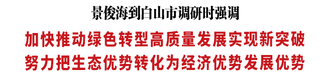 调研中,景俊海主持召开汇报会。在听取并肯定白山市工作后,景俊海强调,白山生态资源丰富,发展潜力巨大。一要坚定不移激变量、提增量、扩总量,科学规划发展绿色食品、医药健康、旅游康养、矿泉水、硅藻土等重点产业,培育壮大数字经济、网红经济、直播电商等新模式,常态化、专班化、机制化招商引资、招才引智,加快重大项目建设,着力打造新增长极。二要坚定不移抓协调、强联动、促开放,做足吉浙对口合作文章,全面加强与长春市、吉林大学等高等院校科研院所深度合作,盯住国内重点区域开展产业集群化合作,引一批企业、落一批项目,构筑发展新优势。三要坚定不移抓环保、强生态、守底线,推动高端生态向高端产业、特色资源向特色产品转变。四要坚定不移保民生、增民利、聚民心,着力解决群众急难愁盼问题;面向白山留人才、面向东北聚人才、面向全国引人才,以人兴引领振兴;统筹抓好防汛、安全生产、常态化疫情防控等工作,切实维护社会大局稳定。五要坚定不移抓党建、强队伍、转作风,学思践悟习近平总书记“七一”重要讲话精神,扎实开展党史学习教育、政法队伍教育整顿、“作风建设年”,推进全面从严治党向纵深发展,营造干事创业的良好氛围。