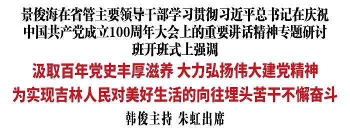 7月12日,省管主要领导干部学习贯彻习近平总书记在庆祝中国共产党成立100周年大会上的重要讲话精神专题研讨班开班式以视频形式举行。省委书记景俊海出席开班式并讲话。他强调,要深刻领悟、全面贯彻习近平总书记“七一”重要讲话精神,汲取百年党史丰厚滋养,大力弘扬伟大建党精神,为实现吉林人民对美好生活的向往埋头苦干、不懈奋斗。省委副书记、省长韩俊主持开班式。党史学习教育中央第二指导组组长朱虹出席。