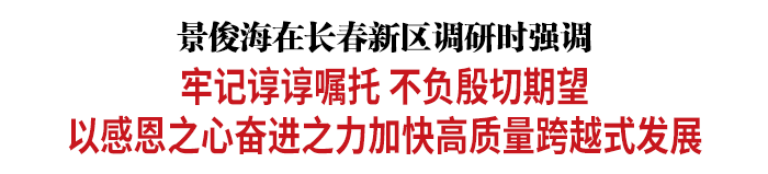 调研中,景俊海主持召开汇报会。在听取并肯定相关工作后,景俊海强调,长春新区作为吉林振兴发展的重大平台和重要引擎,必须牢记习近平总书记视察长春新区谆谆嘱托,加快推动各项事业高质量跨越式发展,打造新的经济增长极。一要夯实创新这一动力支撑,聚焦“一主、六双”产业空间布局,围绕生物医药、航天信息、电子信息、先进装备制造等主导产业,持续深化与高校、科研院所、重点企业合作,推动要素资源向创新驱动、重大项目、重点企业汇聚,加快形成规模效应、优化产业生态、实现集群发展。二要夯实项目这一基础支撑,围绕“专精特新”领域开展深度招商,积极发展新产业新业态新模式,着力打造一批含金量高、驱动力强、带动面广的重大项目,确保尽快落地、应统尽统。三要夯实人才这一关键支撑,用足用好人才政策,建好创新创业平台,苦口婆心留人才,千方百计引人才,海纳百川用人才,真正打好人才这张“王牌”。四要夯实机制这一根本支撑,坚持小机构、大服务,切实做到管理体系与企业需求无缝衔接,努力让服务功能持续提升、营商环境持续优化、吸纳能力持续增强。