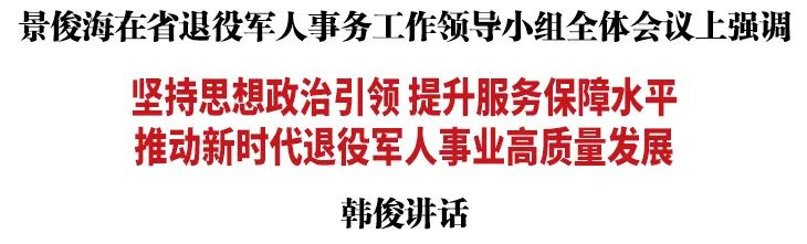 景俊海强调,做好退役军人工作,事关强国强军事业大局,必须进一步完善政策、强化举措、抓好落实,扎实推进退役军人事务治理体系和治理能力现代化建设。一要坚持固根本,常态化组织学习习近平新时代中国特色社会主义思想,扎实开展党史学习教育,大力弘扬英模精神,引导退役军人离队不离心、退伍不退志、永葆革命军人本色,进一步增强“四个意识”、坚定“四个自信”、做到“两个维护”,始终在思想上政治上行动上同以习近平同志为核心的党中央保持高度一致。二要坚持谋长远,科学编制我省退役军人事业发展“十四五”规划,创新完善配套政策措施,在法治轨道上规范和促进退役军人工作,依法维护退役军人合法权益。三要坚持办实事,建立更加科学、合理、可持续的接收安置体系,促进退役军人投身大众创业、万众创新,抓好帮扶援助和激励关爱,持续提高服务保障效能,切实解决后路、后院、后代等事关退役军人切身利益的实际问题。四要坚持防风险,妥善解决信访诉求,坚决把矛盾隐患化解在基层、消灭在萌芽,全力维护社会和谐稳定。五要坚持聚合力,进一步压实工作责任,健全基层服务保障体系,强化退役军人系统干部队伍建设,大力宣传优秀退役军人和爱国拥军模范先进事迹,努力营造关心关爱退役军人的浓厚氛围。