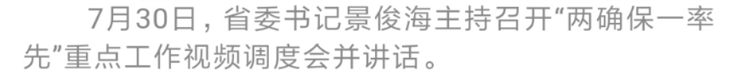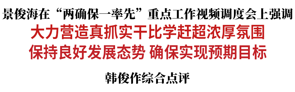7月30日,省委书记景俊海主持召开“两确保一率先”重点工作视频调度会。他强调,要深入贯彻习近平总书记视察吉林重要讲话重要指示精神,认真落实省委十一届九次全会部署,全面实施“一主六双”高质量发展战略,大力营造真抓实干、比学赶超浓厚氛围,保持良好发展态势,确保实现预期目标。省委副书记、省长韩俊作综合点评。