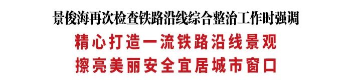 景俊海强调,深入开展铁路沿线综合整治,对改善沿线城乡环境、保障铁路运输安全具有重要意义,必须提高政治站位,坚持问题导向,扎实推进整治,确保铁路沿线环境明显改善,更好满足人民群众对美好生活的向往。一要加大配合协作力度,加强与铁路有关方面对接合作,共同梳理重点难点问题,列出清单、集中攻坚、全力整改,解决一项销号一项,确保各项整改措施落到实处。二要加大违建拆除力度,依法拆除私搭乱建、简破厂棚、废弃建筑等,加快推进沿线棚户区改造,关闭转移沿线小散企业,妥善安置拆迁群众和企业职工。三要加大规范管理力度,聚焦城乡接合部等治理重点,集中开展专项整治,按时清理生活垃圾、建筑垃圾、生活污水等,规整堆放货场物料,常态化搞好监控巡查和清扫保洁,严管重罚乱堆、乱放、乱倒垃圾等行为,确保铁路沿线时刻保持清净整洁,确保整治效果让群众看得见、感受到。四要加大隐患排查力度,聚焦公铁交叉路口、桥涵隧道等重要交通节点,强化交通安全管理,完善防洪排涝措施,做好防御极端灾害天气的充分准备,把隐患彻底消除在萌芽状态,坚决遏制安全事故发生,保障列车运行绝对安全。五要加大绿化美化力度,坚持因地制宜,采取密植绿树、新建绿地、修建绿篱和拆墙透绿、拆违还绿、见缝插绿等措施,进一步提高绿化面积、丰富绿化层次、增加绿化密度,形成防风减噪林带,既保障行驶安全,又打造绿色长廊。六要加大宣传教育力度,引导广大群众强化安全意识、自觉爱路护路,营造全社会维护铁路沿线良好环境的浓厚氛围。