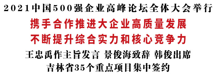 9月25日,2021中国500强企业高峰论坛全体大会在长春举行。全国政协原副主席、中国企业联合会会长王忠禹作了题为“坚定信心 奋发有为 全力推进高质量发展”的主旨发言。吉林省委书记景俊海致辞,省委副书记、省长韩俊出席大会。吉林省35个重点项目集中签约,签约额1184.08亿元。