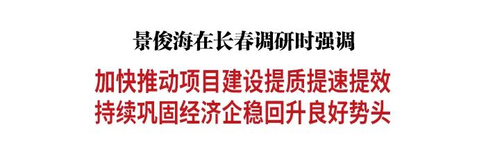 10月20日,省委书记景俊海到长春市,就项目建设进行调研。他强调,要深入贯彻习近平总书记视察吉林重要讲话重要指示精神,全面实施“一主六双”高质量发展战略,加快推动项目建设提质提速提效,持续巩固经济企稳回升良好势头,坚定不移向着“两确保一率先”目标奋进。