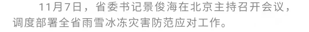 近期,我省出现雨雪、寒潮及大风天气。11月7日,正在北京准备参加中央有关会议的省委书记景俊海主持召开会议,调度部署全省雨雪冰冻灾害防范应对工作。他强调,要深入贯彻习近平总书记关于防灾减灾救灾工作的重要讲话重要指示精神,坚持以人民为中心的工作导向,心系群众安危冷暖,坚决守住民生底线,严阵以待做好迎战极端天气准备,最大限度保障群众正常生产生活。省委副书记、省长韩俊出席会议。