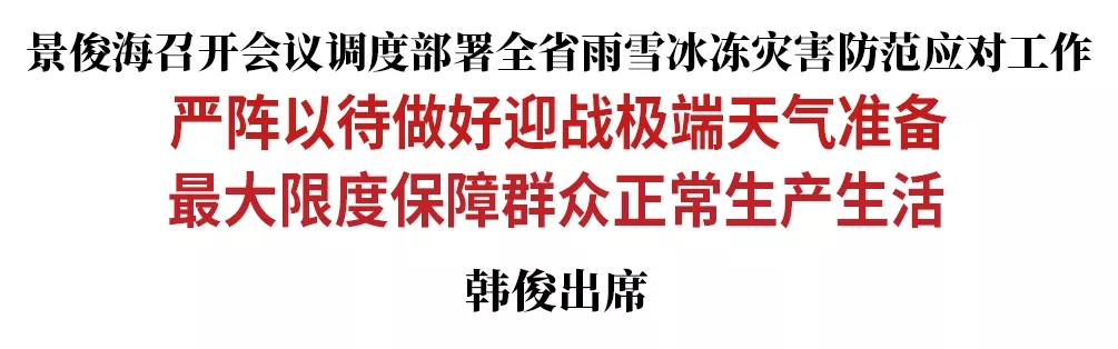 景俊海强调,当前,全省上下必须把防范应对雨雪冰冻灾害作为当务之急,提高警惕、提前部署,迅速进入状态,采取有效举措,确保万无一失。一要进一步强化气象监测预警,科学搞好会商研判,及时发布预警信息,完善应急预案,充实物资储备,必要时采取交通管制、停工停课等措施,确保有备无患。二要进一步做好除冰清雪准备,充分发挥地方与部队应急联动作用,及时组织人员、调集设备开展除冰清雪,千方百计保障道路畅通、交通安全,遇到紧急情况立即开展应急救援,全力确保人民群众生命安全。三要进一步抓好民生保障,突出医院、养老院、自来水厂等重点部位,及时配备备用电力设施,有效抓好电网调度、电煤供应,加强供电供水供热设施巡查、管线维护,一旦发现问题立即抢修,竭尽全力保供电稳定、保供热达标、保供水安全,尽最大努力把对群众生活影响降到最低。四要进一步加强值班值守,建立健全信息通报机制,切实做到强监管、补短板、堵漏洞、防风险、守底线。各地各有关部门要压紧压实责任,一把手要靠前指挥,分管领导要分兵把口、充分准备、有效处置,提前做好机场、车站、高速路口、景区景点等处可能出现的滞留人员基本生活保障工作,加大农业防灾减灾指导力度,保障好粮油肉蛋奶蔬菜等生活必需品供应和通讯畅通,确保经济社会平稳健康发展。