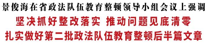 景俊海强调,中央第五督导组指出的问题、提出的建议,对我们进一步巩固和深化教育整顿成果、推动我省政法工作高质量发展,具有十分有力的促进作用。一要进一步提高政治站位,切实把思想和行动统一到习近平总书记重要指示精神和党中央决策部署上来,以更加坚定的信心、更加坚决的态度、更加扎实的作风,推动教育整顿取得新的更大成效。二要进一步强化组织领导,省教育整顿办要统筹各方力量,层层传导压力;省级政法各单位要坚持主动认领、举一反三、标本兼治,倒排工期、挂图作战、循图推进,既要扎实做好自身问题整改,又要研究解决本系统共性问题;省纪委监委要进一步加大组织查处力度,推动存量案件线索尽快取得突破;省级指导组要由常规性督导向重点督导转变,围绕加强政治建设、肃清流毒影响、顽瘴痼疾整治、案件线索查办、制度机制建设、督导意见整改6个方面进行“点穴式”督导。三要进一步严肃督导问责,强化验收把关,对成效较好的单位,及时总结经验做法,大力宣传推广;对成效不够显著的单位,列为重点对象,持续跟踪补课,推动做好深入整改工作;对弄虚作假、应付了事的单位,要严肃追责问责,切实做到问题不整改不放过、整改不到位不放过、责任不追究不放过,确保经得起群众和历史的检验。
