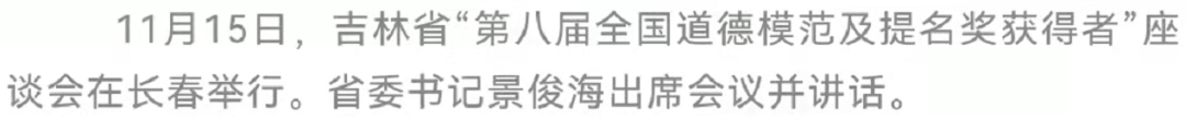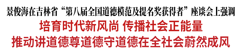 11月15日,吉林省“第八届全国道德模范及提名奖获得者”座谈会在长春举行。省委书记景俊海在座谈会上强调,要深入贯彻习近平总书记关于加强道德建设的重要论述和党的十九届六中全会精神,按照第八届全国道德模范座谈会要求,充分发挥道德模范标杆的引领示范作用,培育时代新风尚,传播社会正能量,推动讲道德、尊道德、守道德在全社会蔚然成风。