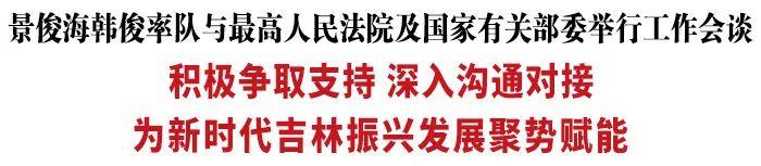 景俊海与最高人民法院党组书记、院长周强举行会谈,衷心感谢最高人民法院对吉林振兴发展的关心帮助,希望最高人民法院一如既往支持吉林工作,对长春中央法务区建设等工作给予指导和法律政策支持,助推我省打造市场化法治化国际化营商环境,不断提高法治吉林建设水平。吉林一定深入贯彻习近平法治思想,始终坚持司法为民、公正司法,持续深化司法体制改革,扎实推进健全府院联动机制、建设智慧法院等工作,以法治手段破解发展中遇到的各种矛盾问题,更好发挥法治固根本、稳预期、利长远保障作用。周强充分肯定我省法治建设和法院工作成效,表示将全力支持、积极推动长春中央法务区建设,认真总结推广吉林法院工作好经验好做法,助力提高法治吉林建设水平。要求吉林各级法院深入贯彻习近平法治思想和习近平总书记视察吉林重要讲话重要指示精神,认真学习贯彻党的十九届六中全会精神,紧紧依靠党委领导,统筹发展和安全,不断提高审判质效,促进司法为民、公正司法,切实把工作成效体现到保障重大战略实施、有效防范化解风险、打造一流法治环境营商环境上来,为新时代吉林全面振兴全方位振兴提供有力司法服务。