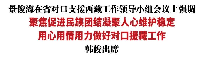 会议强调,抓好对口援藏工作是一项重大政治任务,必须提高站位、强化担当,坚决把各项任务完成好。一要做好交往交流交融文章,建立健全互访交流工作机制,继续深化学校、医院等领域结对共建,组织更多面向基层群众和青少年等群体的交流活动,让各族群众像石榴籽一样紧紧抱在一起。二要做好产业项目合作文章,持续深化现代农业、清洁能源、生态环保、文化旅游、电子商务等方面合作,谋划实施一批大项目好项目,加快在建项目建设进度,着力推动受援地高质量发展。三要做好干部人才队伍文章,坚持好中选优、优中选强,再为受援地输送一批工作能力突出、责任心强的优秀干部;瞄准乡村振兴、科技教育、卫生医疗等领域,有针对性地培养一批当地短缺和急需人才,留下一支“带不走”的援藏队伍;开展多层次人才合作交流,探索完善挂职锻炼、对口轮训、赴吉工作等方式,积极开展传帮带;充分保证援藏干部人才各方面待遇,妥善解决家属就业、子女就学等问题,确保援藏干部人才没有后顾之忧。四要做好保障改善民生文章,突出稳就业、强医疗、重教育,把对口支援项目和工作重心向解决农牧民住房、安全饮水、照明用电、交通出行等领域倾斜,加强基础设施和公共服务体系建设,深入开展医疗惠远工程,加大选派支教教师、学校结对帮扶工作力度,加快补齐农业农村短板弱项,进一步改善受援地群众生产生活条件。五要做好社会安全稳定文章,引导各族群众树立正确的国家观、历史观、民族观、文化观、宗教观,不断增强中华民族共同体意识,更好地促进民族团结进步、维护边疆长治久安。