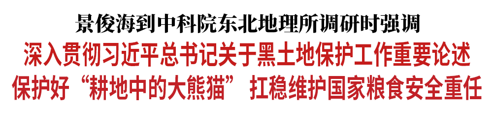 调研中,景俊海主持召开座谈会,听取中科院东北地理所汇报。景俊海说,长期以来,中科院东北地理所紧密结合东北农业发展实际,聚焦农业科技难题,深入攻坚、持续创新,做了大量超前研究和细致工作,在加快吉林现代农业建设进程中发挥了举足轻重作用。希望中科院东北地理所聚焦吉林经济社会发展需求,着眼“新农业”发展方向,紧紧围绕耕地和种子两个关键要素,进一步推进生物育种、耕作保护、智慧农业等领域科技创新,持续提高科研效能,不断取得新的更大成果。要坚持创新引领,大力推进“黑土粮仓”科技会战,加大生物育种、耕作技术等领域科技攻关力度,有效推进黑土地数量、质量、生态“三位一体”保护,因地制宜推广梨树模式,既充分利用秸秆资源,又有效增强土壤肥力;着力建设一流创新平台,吸引培养更多素质高、业务强的农业技术人才。要坚持技术集成,促进育种与耕种、工程与生物、农机与农艺、用地与养地相结合,大力推广成熟易行的耕作技术,多措并举推动粮食稳产增产。要坚持分区施策,以生态方法治理利用盐碱地,能够原状利用的要科学选种、精耕细作,需要改良利用的要精准研判、综合治理,力争以最小投入达到最佳效果。要坚持夯实基础,持续加强高标准农田建设,结合“大水网”工程、万里绿水长廊、林草湿生态连通工程实施,进一步提升田间设施配套能力,尽快实现地平整、土肥沃、田成方、林成网、路相通、渠相连。要坚持多方参与,进一步加强创新模式研究,更好调动农民和企业积极性,有效促进适度规模经营,助力吉林加快现代农业建设、率先实现农业现代化。