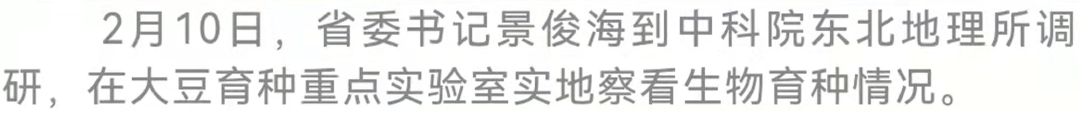 2月10日,省委书记景俊海到中科院东北地理所,看望慰问一线科研人员,就黑土地保护利用工作进行调研。他强调,要深入贯彻习近平总书记视察吉林重要讲话重要指示精神特别是关于黑土地保护工作重要论述,扎实推动“黑土粮仓”科技会战,科学保护、有效利用黑土地这个“耕地中的大熊猫”,加快推动全省粮食产量迈上千亿斤台阶,助力吉林扛稳维护国家粮食安全“压舱石”重任。