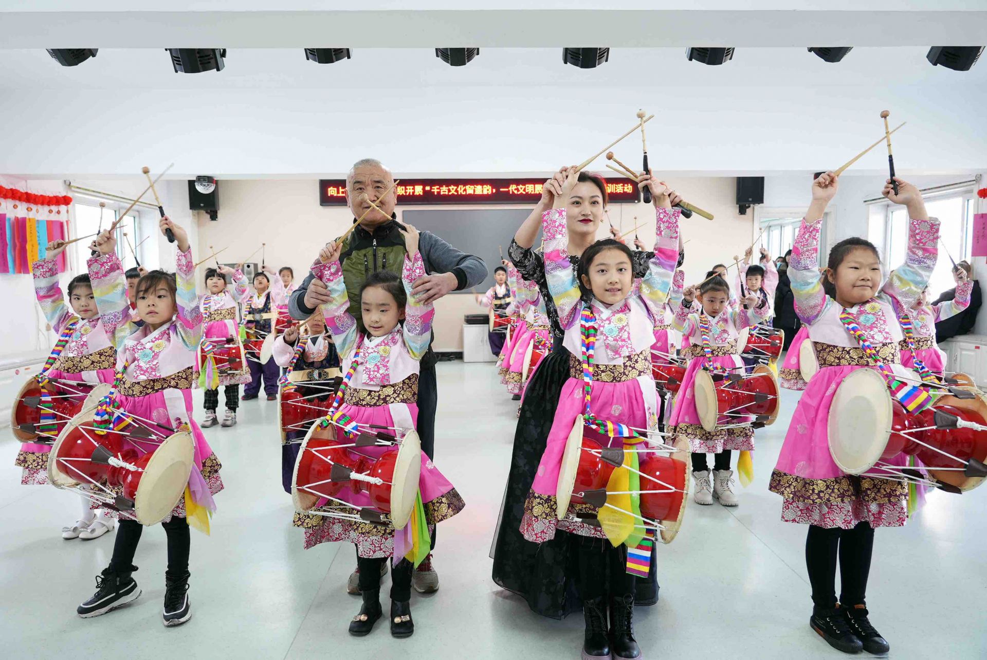 活动伊始,国家级非物质文化遗产——朝鲜族长鼓舞第五代代表性人物朴圣夑耐心指导孩子们长鼓舞,让他们一只手用一尺长的鞭敲打着高音鼓面,另一只手拍打低音鼓面,由慢板起拍逐渐加快,鼓声高低起伏,节奏不同变换,变化多端的鼓点和着优美的舞姿,使大家格外的兴奋和愉悦。最后,鼓声在飞快的旋转中,嘎然停止,使人热血沸腾、激动异常。