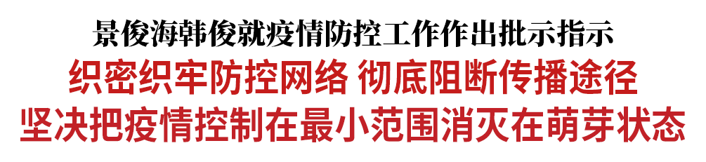 景俊海指出,疫情防控工作容不得半点马虎,由不得丝毫松懈,必须高度重视、迅速行动、全力攻坚,力争尽早扑灭疫情。有关地区和部门要立即启动应急指挥系统,压紧压实各方责任,确保各项防控措施不折不扣落实到基层一线。珲春市要提级管理、强化管控,暂停举办一切聚集性活动。要抓紧开展流调排查溯源工作,精准确定传播链条,相关人员要严格执行隔离措施,该集中隔离的集中隔离,该居家隔离的居家隔离,确保不落一人。要迅速集中全省检测力量,充分发挥移动核酸检测车机动优势,尽快前往珲春开展工作,立即启动全员核酸检测,切实做到应检尽检。要进一步强化口岸防控,全面落实人、物、环境同防要求,严格执行进口冷链食品消杀措施,做到重点岗位人员集中工作、集中隔离、定期检测。要加强农村疫情防控,严格落实责任措施,全面排查外来人员,认真开展预防性消杀。要全力做好医疗救治,调动集中医护力量,准备充足病床、药品,既要不惜一切代价救治新冠肺炎患者,又要保障好其他群众就医需求。要加大物资供给力度,千方百计确保基本生活物资供应充足、价格稳定。要教育引导群众戴口罩、少聚集、不握手、勤洗手、多消毒、常通风,保持良好卫生习惯,增强个人防护意识,严防疫情传播风险。要统筹抓好疫情防控和经济社会发展,维护好正常生产生活秩序。