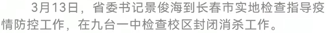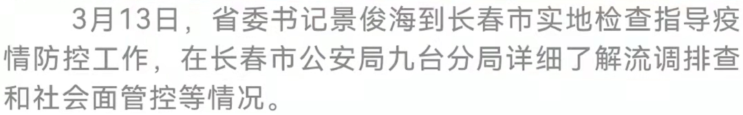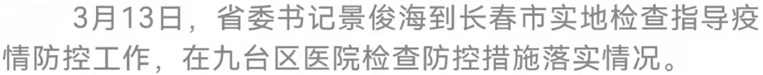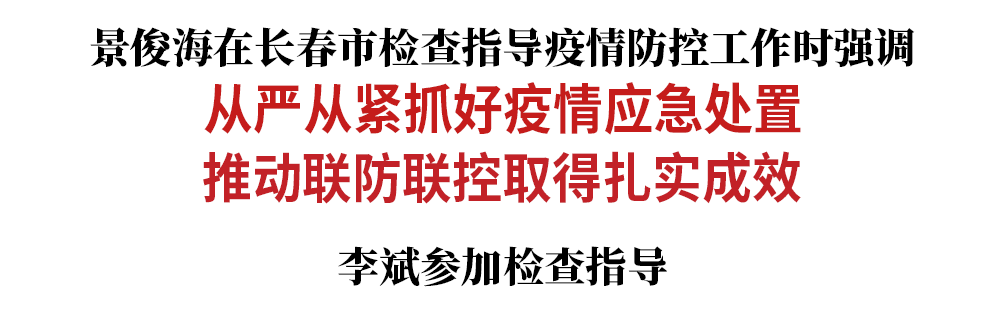 3月13日,省委书记景俊海深入长春市九台区、净月高新技术产业开发区,实地检查指导疫情防控工作,看望慰问奋战在一线的医护人员和干部群众。他强调,要深入贯彻习近平总书记关于疫情防控工作的重要讲话重要指示精神,瞄准薄弱环节,解决突出问题,从严从紧抓好疫情应急处置,推动联防联控取得扎实成效。国务院联防联控机制综合组吉林工作组组长、国家卫生健康委副主任李斌参加检查指导。