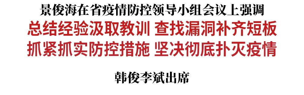 景俊海指出,当前,我们正在经历全省疫情防控常态化以来,形势最严峻、挑战最直接、工作最复杂的一次大战大考。全省上下必须以更实举措、更硬作风、更大力度控制住疫情扩散蔓延,坚决做到应检尽检、应隔尽隔、应治尽治、应管尽管,争分夺秒实现社会面清零。一要切实管住人,着力强化社会面管控,确保非必要不流动、不聚集;加强对学校、养老院、监所等重点人员聚集场所日常监测,及时排查隐患、消除风险。二要精准找到人,抓紧推进全员核酸检测,大力推广抗原检测技术,边检测、边流调、边隔离,真正找出所有密接、次密接人员,尽快把所有密接人员转运到集中隔离点,彻底阻断社区传播。三要全力救治人,充分利用闲置厂房、场馆等资源,加快建设方舱医院、方舱隔离点,对感染者要及时转送定点医院救治,不惜一切代价确保患者生命安全。四要用心服务人,对患者和隔离人员要充分运用微博、微信等社交应用平台,有的放矢地开展在线交流、心理疏导、情绪安抚等工作,缓解心理焦虑,打通思想堵点;完善物资储备和调用机制,强化市场价格监管,确保基本生活物资供应充足、价格稳定。