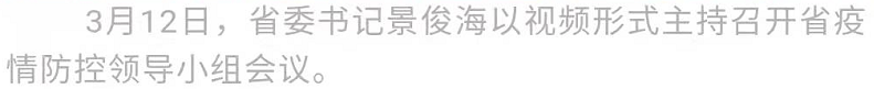 3月12日晚上,省委书记景俊海继续在吉林市以视频形式主持召开省疫情防控领导小组会议。他强调,要深入贯彻习近平总书记关于疫情防控工作的重要讲话重要指示精神,按照全国疫情防控工作电视电话会议精神和孙春兰副总理部署要求,总结经验、汲取教训,查找漏洞、补齐短板,抓紧抓实防控措施,坚决彻底扑灭疫情。省委副书记、省长韩俊,国务院联防联控机制综合组吉林工作组组长、国家卫生健康委副主任李斌出席会议。