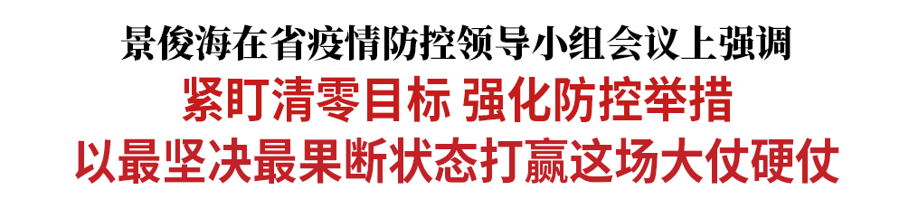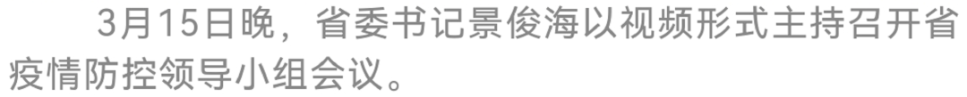 3月15日晚上,省委书记景俊海以视频形式主持召开省疫情防控领导小组会议。他强调,要深入贯彻习近平总书记关于疫情防控工作的重要讲话重要指示精神,按照孙春兰副总理调研指示要求,坚持把疫情防控作为当前头等大事,紧盯清零目标,强化防控举措,以最坚决最果断状态打赢这场大仗硬仗。
