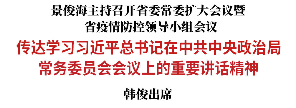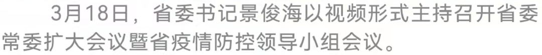 今天(3月18日),省委书记景俊海以视频形式主持召开省委常委扩大会议暨省疫情防控领导小组会议,传达学习习近平总书记在3月17日中共中央政治局常务委员会会议上的重要讲话精神,进一步调度部署全省疫情防控工作。景俊海强调,要坚决贯彻落实习近平总书记重要讲话精神,始终坚持人民至上、生命至上,坚持科学精准、动态清零,以时不我待的精神抓实抓细疫情防控各项工作,尽锐出战、决战决胜,尽快遏制疫情扩散蔓延势头,坚决打赢这场保卫战歼灭战阻击战。省委副书记、省长韩俊出席会议。