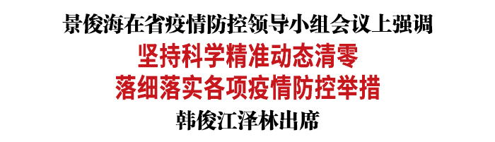 景俊海指出,当前,我省疫情防控仍处在与病毒胶着对垒的关键阶段。坚持就是胜利,坚持才能胜利。全省上下要深刻认识当前疫情防控形势的复杂性、艰巨性、反复性,压紧压实各方责任,进一步提高科学精准防控水平,不断优化疫情防控举措,扎实抓好感染者分类施治,做到应检尽检、应隔尽隔、应治尽治、应管尽管,有效提升阻断传播的速度和力度,切实保障人民群众生命安全和身体健康。要加快推进疾控体系改革,进一步提升应急处置能力,稳妥有序推进疫苗接种,夯实筑牢群体免疫屏障。