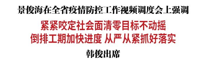 3月20日下午,省委书记景俊海主持召开全省疫情防控工作视频调度会。他强调,要深入贯彻习近平总书记关于疫情防控工作的重要讲话重要指示精神,按照孙春兰副总理部署要求,坚定信心、咬紧牙关,提速提速再提速,务实务实再务实,紧紧咬定社会面清零目标不动摇,倒排工期加快进度,从严从紧抓好落实,坚决打好打赢这场硬仗。省委副书记、省长韩俊出席会议。