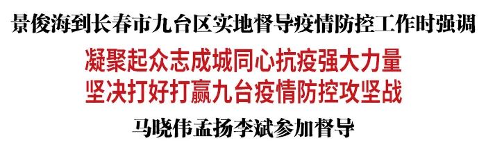 3月20日晚上,省委书记景俊海连夜前往长春市九台区,实地督导疫情防控工作,扁平化指挥做好隔离转运。景俊海强调,九台党政领导干部要切实把思想和行动统一到习近平总书记关于疫情防控工作的重要讲话重要指示精神上来,按照孙春兰副总理部署要求,坚定信心、咬紧牙关、一鼓作气,凝聚起众志成城、同心抗疫的强大力量,坚决打好打赢九台疫情防控攻坚战。国家卫生健康委主任、党组书记马晓伟,国务院副秘书长孟扬,国务院联防联控机制综合组吉林工作组组长、国家卫生健康委副主任李斌参加督导。