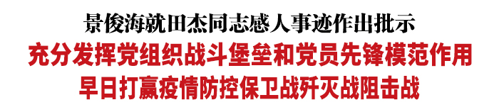 景俊海指出,田杰同志在我省疫情防控这场特殊战役中,不顾安危、逆行出征,勇于担当、冲锋在前,因连日劳累突发疾病,为维护群众生命和身体健康献出了宝贵生命,用实际行动诠释了一名共产党员的忠诚与担当。对田杰同志不幸牺牲表示沉痛悼念,向其家属致以亲切慰问。田杰同志是我省疫情防控工作中涌现出的先进典型和杰出代表,全省上下要学习田杰同志对党忠诚的政治品格、心系群众的为民情怀、冲锋在前的担当精神、严新细实的工作作风、忘我奉献的高尚情操,在抗疫一线充分发挥党组织战斗堡垒和党员先锋模范作用,万众一心、众志成城、共克时艰,早日打赢疫情防控保卫战、歼灭战、阻击战。相关部门要做好善后抚恤工作,大力宣传田杰同志感人事迹。各地各部门要周密落实防控措施,关心关爱每一位一线抗疫人员,科学合理安排工作和休息,保护好大家的身体健康和生命安全。向所有奋战在抗疫一线的同志们致敬。