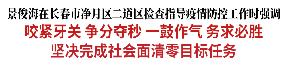 景俊海强调,净月、二道广大党员干部要深刻认识当前疫情防控的复杂性、艰巨性、反复性,进一步强化担当、履职尽责,从严从紧、从细从实抓好疫情防控各项工作,尽快实现社会面清零目标。要进一步完善优化合成作战体系,加强与包保支援地区协同合作,充分发挥省级领导包保县(市、区)、市级领导包保街道(乡镇)、县级领导包保社区作用,投入更多力量到基层一线,集中兵力打歼灭战。要深入开展疫情防控大排查、问题整改“回头看”,着力找盲点、堵漏洞、补短板、强弱项,制定问题清单,明确整改任务,压紧压实责任,坚决果断务实,彻底打通疫情防控堵点痛点。要突出办公楼、小旅馆、小浴池、小超市等场所,精准实施“敲门行动”“扫地行动”,进一步扩大全员检测筛查覆盖面,确保应查尽查、应检尽检。要加强各地包保支援人员自身防护,强化集中隔离点闭环管理,大力推进中药预防应用,坚决防止疫情扩散外溢。要对小区、楼道、电梯等环境实施无死角消杀,最大限度消除潜在风险。要有效提升社区管控和服务保障能力,保持大型商超线上订购渠道畅通,打通保供配送“最后一百米”,切实满足群众基本生活和就医用药需求。要积极创建“无疫小区”,根据疫情发展变化调整管控措施,稳妥有序恢复正常生产生活秩序。
