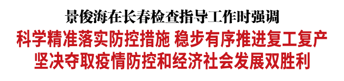 4月14日,省委书记景俊海到长春市,实地检查指导疫情防控、复工复产等工作。他强调,要深入贯彻习近平总书记关于疫情防控的重要讲话重要指示精神,按照孙春兰副总理部署要求,科学精准落实防控措施,稳步有序推进复工复产,坚决夺取疫情防控和经济社会发展双胜利。