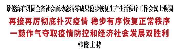 景俊海强调,各级党委、政府要坚持稳字当头、稳中求进,统筹抓好疫情防控和经济社会发展。要坚持梯度推进、循序渐进、科学精准,分地区、分行业、分类型组织复工复产。要扎实推动项目建设,加大要素保障和服务力度,帮助企业解决实际问题。要启动“网上对接会”“视频推介会”等招商活动,全面提高引资规模。要把握好时度效,稳步推进复商复市,进一步落实纾困政策,促进消费回补。要突出抓好春耕生产,争分夺秒推动农民快返乡、农资快下摆、农机快检修、资金快到位,确保不误农时。要全力保障改善民生,加大援企稳岗力度,加强生活物资政府调配和市场供应,切实满足群众基本生活需求。