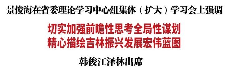 4月25日,省委书记景俊海主持召开省委理论学习中心组集体(扩大)学习会,聚焦事关吉林长远发展重大问题,深入交流省级领导领题调研成果,为省第十二次党代会召开做好充分准备。景俊海强调,要坚持以习近平新时代中国特色社会主义思想为指引,切实加强前瞻性思考、全局性谋划,精心描绘吉林振兴发展宏伟蓝图。省委副书记、省长韩俊,省政协主席江泽林出席会议。