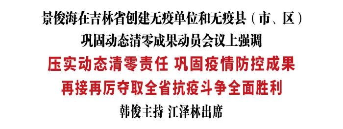 4月30日,吉林省创建无疫单位和无疫县(市、区)、巩固动态清零成果动员会议以视频形式召开。省委书记景俊海出席会议并讲话。他强调,要深入贯彻习近平总书记关于高效统筹疫情防控和经济社会发展的重要讲话重要指示精神,按照孙春兰副总理部署要求,坚持科学精准、真抓实干,进一步压实动态清零责任,巩固疫情防控成果,再接再厉夺取全省抗疫斗争全面胜利。省委副书记、省长韩俊主持会议。省政协主席江泽林出席会议。