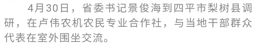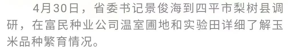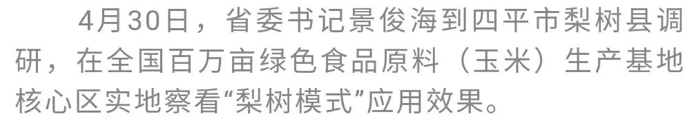 2020年7月,习近平总书记曾到四平梨树县视察,对保护利用黑土地、发展农民专业合作社等工作作出重要指示。又到了春耕时节,梨树县今年农业生产抓得怎么样、春耕进展如何,景俊海非常关心。他再次来到全国百万亩绿色食品原料(玉米)生产基地核心区,实地察看“梨树模式”应用效果,要求进一步推广升级耕作技术,切实保护好、利用好黑土地这一“耕地中的大熊猫”。要加快推进农业数字化、信息化、智能化,不断提高农业生产效率、降低农民劳动强度。要大力实施“秸秆变肉”工程,真正让秸秆资源变废为宝。玉米—大豆间作种植核心示范区已经开始春耕作业。景俊海强调,要落实好各项惠农政策措施,充分调动农民种植积极性,确保春耕播种按时高质量进行。