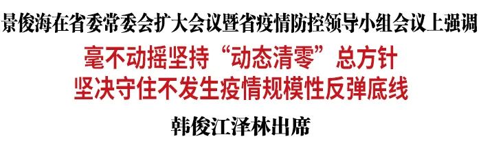 5月6日,省委书记景俊海以视频形式主持召开省委常委会扩大会议暨省疫情防控领导小组会议,传达学习中共中央政治局常务委员会5月5日会议精神,听取我省疫情防控工作汇报,研究部署我省贯彻落实举措。景俊海强调,要深入学习领会、坚决贯彻落实习近平总书记重要讲话精神,深刻、完整、全面认识党中央确定的疫情防控方针政策,毫不动摇坚持“动态清零”总方针,以时不我待的精神、分秒必争的行动抓实抓细疫情防控各项工作,坚决守住不发生疫情规模性反弹底线,再接再厉夺取抗疫斗争全面胜利。省委副书记、省长韩俊,省政协主席江泽林出席会议。