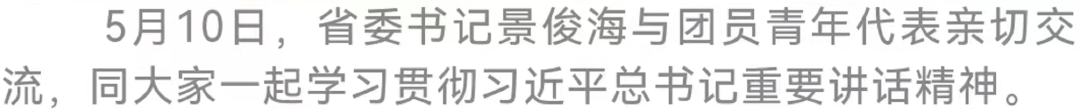 5月10日上午,庆祝中国共产主义青年团成立100周年大会在北京隆重举行。中共中央总书记、国家主席、中央军委主席习近平出席并发表重要讲话。省委书记景俊海等省领导与团员青年代表一起收看电视实况直播,认真聆听习近平总书记重要讲话。