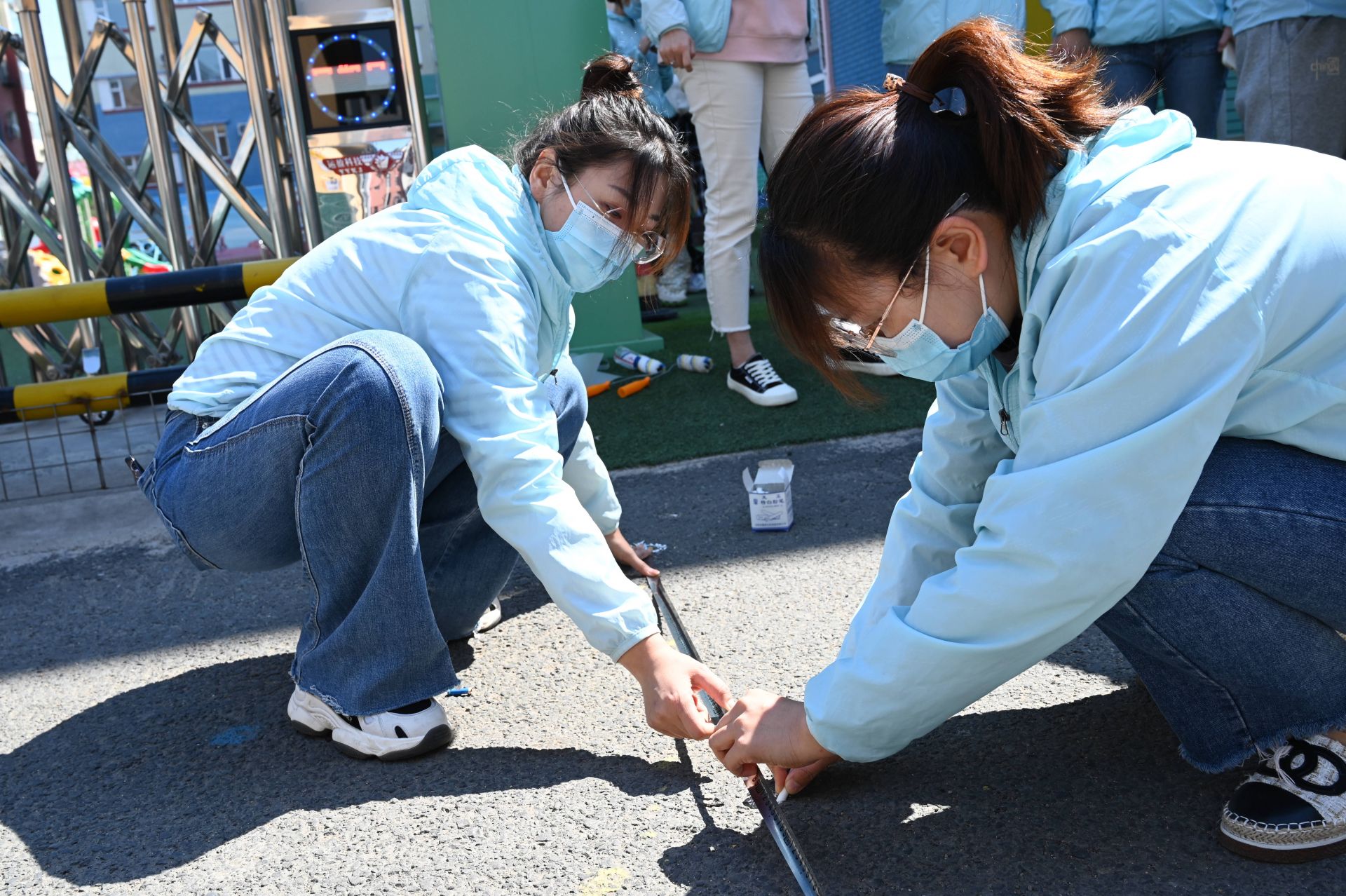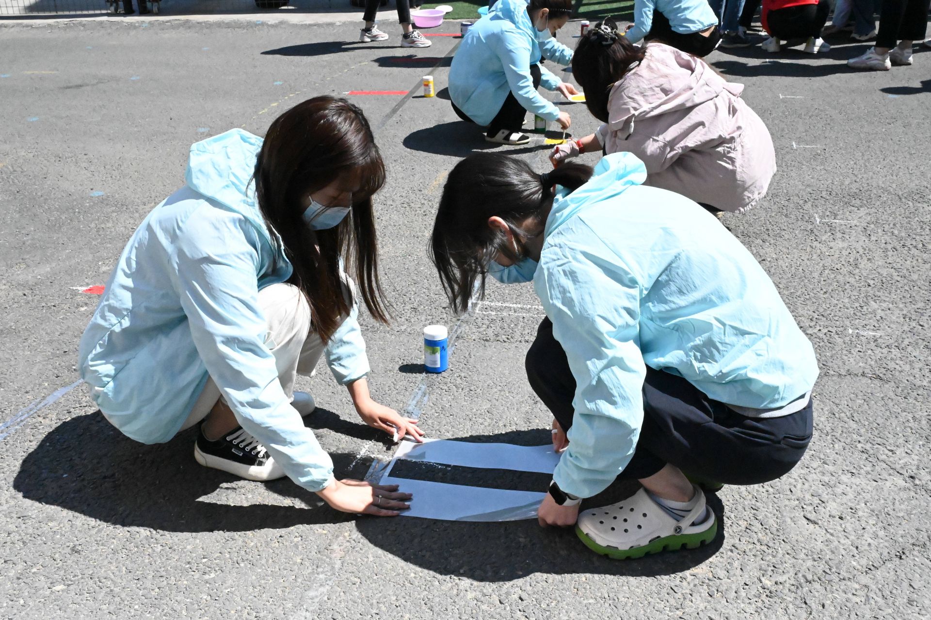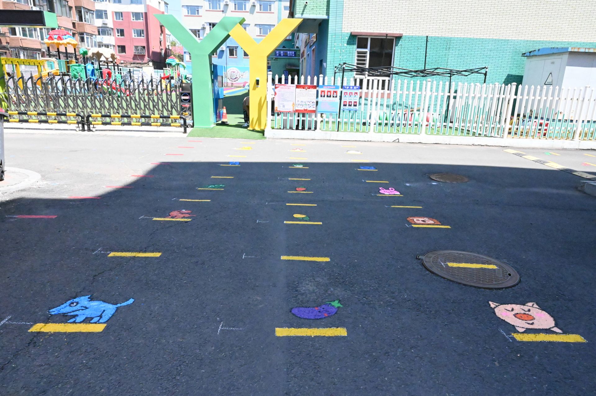 活动中,老师们各展其能、发挥所长,利用油漆和丙烯颜料在幼儿园大门口接送区域内画了安全线,并为安全线充实了丰富多样的图案。看似简单的一个图案,但却蕴含着阳光教师对孩子们满满的爱。