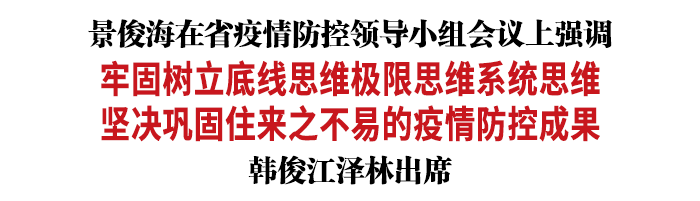 5月25日,省委书记景俊海以视频形式主持召开省疫情防控领导小组会议。他强调,要深入贯彻习近平总书记关于高效统筹疫情防控和经济社会发展的重要讲话重要指示精神,始终坚持人民至上、生命至上,毫不动摇坚持“外防输入、内防反弹”总策略和“动态清零”总方针,牢固树立底线思维、极限思维、系统思维,坚持以变应变、以快制快,抓紧抓实常态化防控和应急处置措施,坚决巩固住来之不易的疫情防控成果。省委副书记、省长韩俊,省政协主席江泽林出席会议。