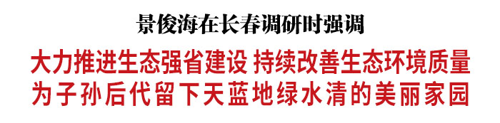 调研中,景俊海主持召开汇报会,听取省直有关部门和长春市工作情况,以及专家学者意见建议。景俊海强调,守护好绿水青山、冰天雪地,是我们义不容辞的责任。一要深入打好污染防治攻坚战,进一步提升空气质量,不断改善水环境质量,持续巩固提升土壤环境质量,让生态美、环境好成为吉林人民高品质生活的“标配”。二要扎实推进绿色低碳发展,深化产业结构、能源结构调整,加快构建绿色产业体系、清洁低碳能源体系、绿色消费体系,促进经济社会发展全面绿色转型。三要加快构建现代环境治理体系,健全完善生态环境治理法规标准政策体系,及时制订秸秆综合利用条例,统筹推进秸秆还田、养牛及畜禽粪便综合利用,实现种养用良性循环;严格落实河长制、湖长制、田长制、林长制,着力加强监管监测,持续深化试点示范。四要坚决守住生态安全底线,以城镇乡村为生态治理重点,以山川河流为生态保护重点,大力推进山水林田湖草沙冰一体化保护和修复,构建稳固的生态安全体系。五要切实抓好中央生态环保督察反馈问题整改落实,坚持举一反三、完善机制,对具体整改任务实行全过程台账式精细化闭环管理,努力通过一个问题整改,推动一类问题解决,健全一方面制度体系。各级党委、政府要进一步压紧压实责任,严格督查考核,加强宣传引导,努力营造全社会共同关注、参与、监督生态环保工作的良好氛围。