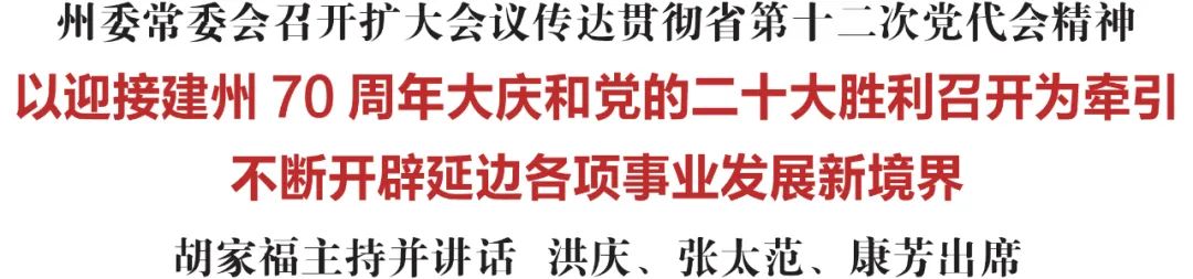 6月27日,省委常委、州委书记胡家福主持召开州委常委会扩大会议,传达学习省第十二次党代会精神,研究部署我州贯彻落实工作。州委副书记、州长洪庆出席会议并传达省第十二次党代会精神,州人大常委会主任张太范、州政协主席康芳出席会议。