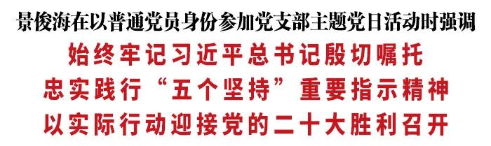 在即将迎来建党101周年之际,6月30日,省委书记景俊海以普通党员身份参加省委办公厅综合一、二处联合党支部“走好第一方阵 迎接二十大召开”主题党日活动,深入学习贯彻习近平总书记视察吉林重要讲话重要指示精神,交流学习心得,锤炼党性修养,推动工作落实。景俊海强调,要始终牢记习近平总书记殷切嘱托,忠实践行“五个坚持”重要指示精神,以实际行动迎接党的二十大胜利召开。