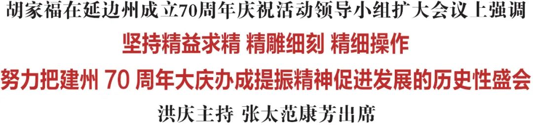 胡家福指出,建州70周年大庆,是全州人民政治生活中的一件大事、要事、喜事,是全面总结延边发展辉煌成就的一次盛会,也是在新的历史起点上推动延边高质量发展的一次盛会。办好建州70周年大庆,是宣传贯彻党的民族政策、促进民族团结进步的生动实践,是展示全州发展成果、提升对外形象的重要平台,是争取各方支持、助推延边发展的重大机遇,对于深入贯彻习近平新时代中国特色社会主义思想,全面落实中央民族工作会议精神,进一步铸牢中华民族共同体意识,不断把延边民族团结进步事业推向前进,具有重大而深远意义。全州上下要进一步提高政治站位,统一思想、凝聚力量,埋头苦干、扎实工作,真正把喜事办好,把大事办实。