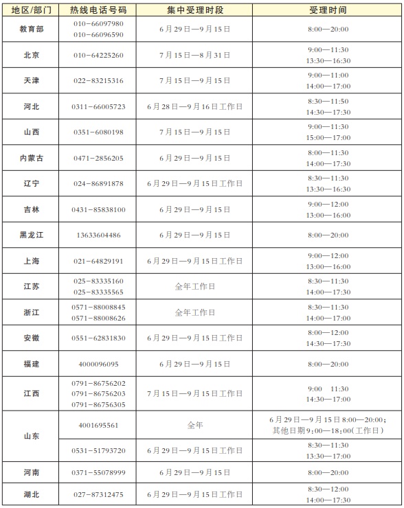 教育部要求各省区市及所属高校、中央高校学生资助管理部门均开通热线电话,并结合实际情况自行确定集中受理时段和具体受理时间。