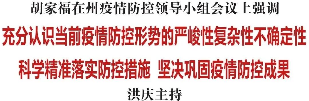 胡家福指出,当前全球新冠疫情持续蔓延,新冠病毒不断发生变异,疫情最终走向还存在很大不确定性,疫情防控形势依然严峻复杂。全州各级各部门要牢固树立底线思维、极限思维、系统思维,坚决贯彻“疫情要防住、经济要稳住、发展要安全”的总要求,高效统筹疫情防控与经济社会发展,努力以最小范围、最短时间、最低代价果断处置突发疫情,为迎接建州70周年大庆和党的二十大胜利召开营造良好社会环境。