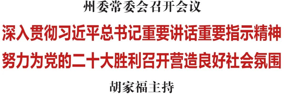 7月8日,省委常委、州委书记胡家福主持召开州委常委会会议,传达学习习近平总书记在湖北武汉考察时的重要讲话精神,传达学习习近平总书记在中央政治局第四十次集体学习时的重要讲话精神和6月17日在中央政治局会议上的重要讲话精神,传达学习习近平总书记就研究吸收网民对党的二十大相关工作意见建议的重要指示精神,传达学习习近平总书记在第二十五届圣彼得堡国际经济论坛全会上的致辞、在金砖国家工商论坛开幕式上的主旨演讲、在金砖国家领导人第十四次会晤上的讲话、在全球发展高层对话会上的讲话精神,审议通过《延边州重点领域项目专班工作机制方案》《州级领导联系服务企业发展工作方案》《延边州应急管理“十四五”规划》,研究部署相关工作。