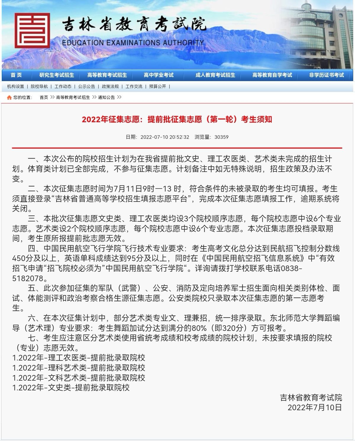 吉林教育考试院发布通知,我省2022年高考提前批征集志愿(第一轮)即将开始,并提示考生注意相关事项。